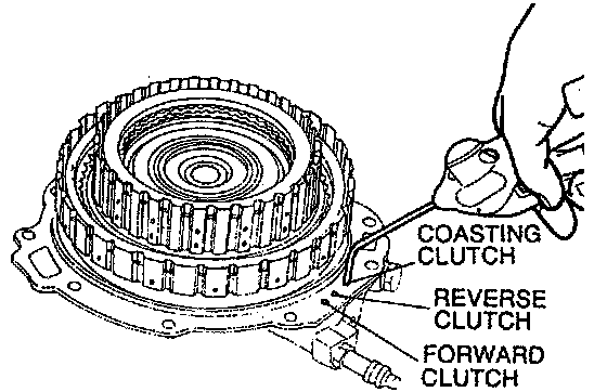 2. Remove the coasting clutch drum from the reverse and forward drum by applying compressed air through the fluid passage.