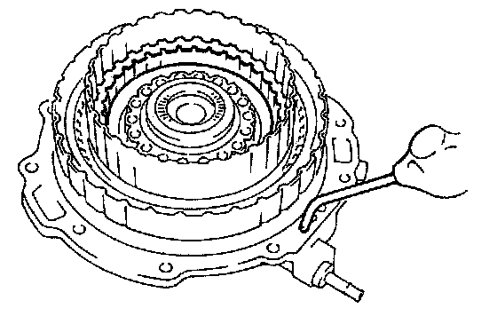 12. Measure the clearance between the retaining plate and the snap ring. Make several measurements and calculate the average value. If the clearance is not within specification, adjust it by selecting a proper snap ring from below.