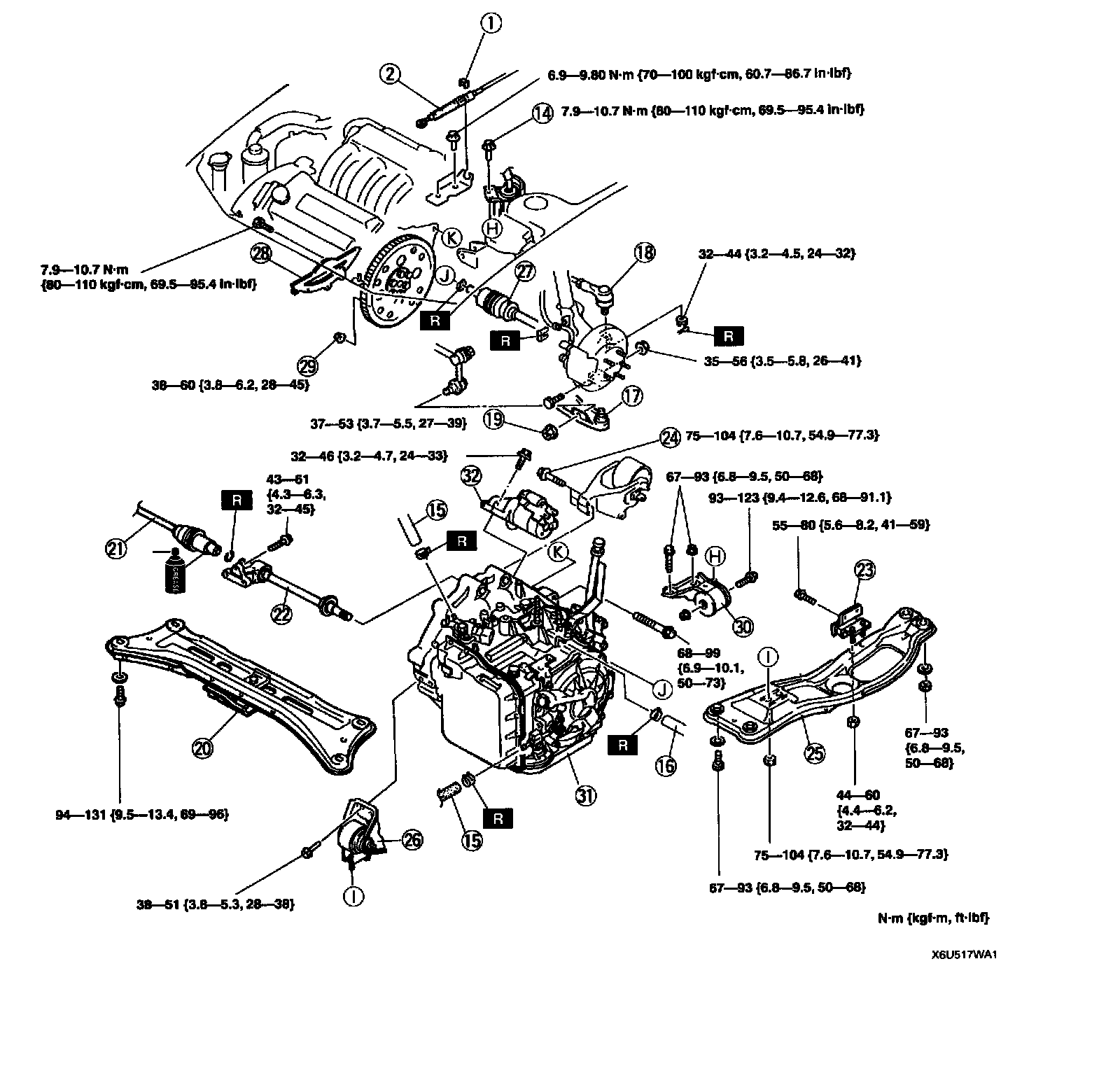 Tightening torque A: 67 - 93 Nm (6.0 - 9.5 kgf-m, 50 - 68 ft. lbs.)