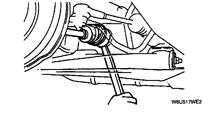 4. Separate the passenger side drive shaft from the transaxle by prying with a bar inserted between the outer ring and the transaxle, as shown in the figure.