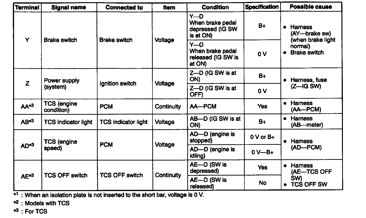 3. Attach a wire to the tester lead to avoid damaging the terminals then inspect voltage, resistance or continuity, referring to the image.