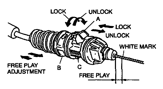 NOTE: To measure the cable free play, push the cable into the housing and put a white mark on the cable at the end of the housing. Then pull the cable out and measure distance from the white mark to the end of the cable housing.