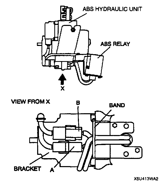 1. Pass the connector from the ABS HU under the bracket, then connect it with connectors A and B from the ABS relay.