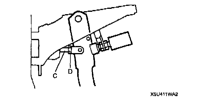 2. Loosen locknut D and turn rod C to align the holes in the fork and in the pedal.