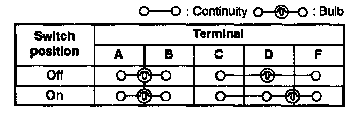 2. Inspect for continuity between the cruise control main switch terminals by using an ohmmeter.