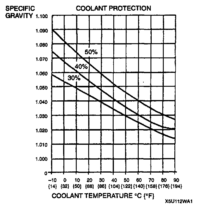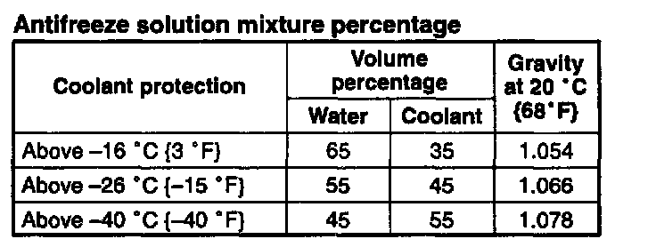 7. Referring to the graph and chart, select proper gravity of the coolant. Slowly pour the coolant into the radiator up to the coolant filler port.