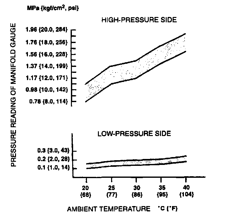11. If the high- and low-pressure side readings are in the shaded zones shown in the figure, the refrigerant system is normal.