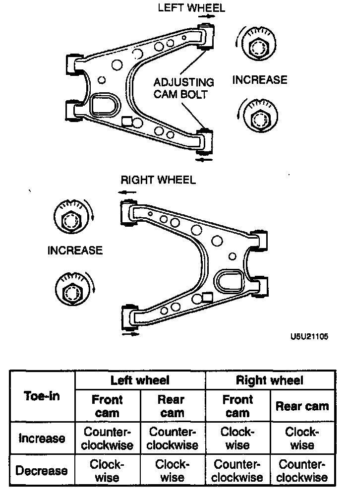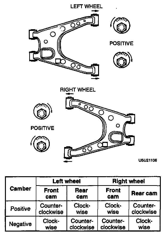 2. Turn the front and rear adjusting cam bolts the same amount in the opposite direction to provide the correct camber angle.