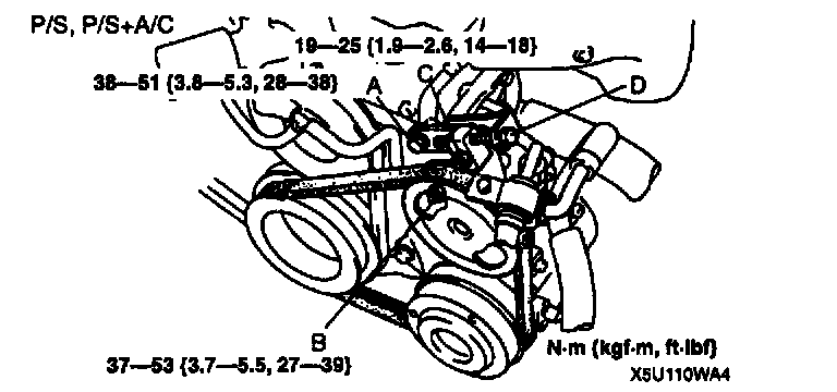 Adjust the belt deflection or tension by turning the adjusting bolt D.