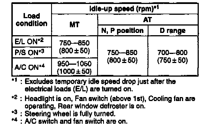 5. If not as specified with all loads conditions, inspect the idle air control valve. If not as specified with some load conditions, inspect related input switches, harnesses and connectors.