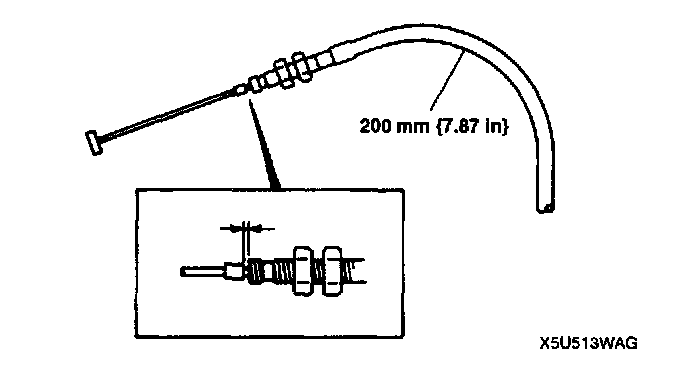 7. With throttle cable installed to the throttle cam, bend near the center of the throttle cable to a radius of 200 mm (7.87 in). Then, pull the throttle cable until there is no play or just before the throttle cam starts to move, and stake the adjustment mark at the position shown in the figure.