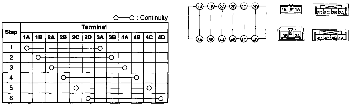 1. Remove the clock spring. (Refer to CLOCK SPRING REMOVAL/INSTALLATION.)2. Inspect for continuity between the clock spring terminals by using an ohmmeter.