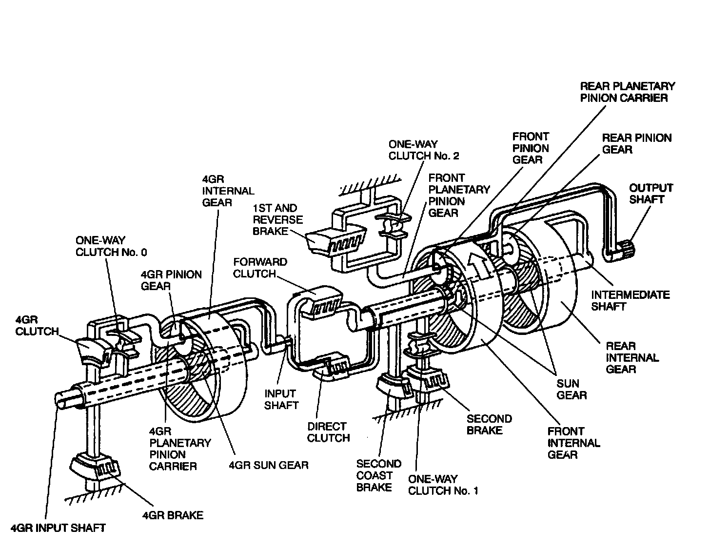 - The driving force of the 4GR input shaft is transmitted to the input shaft because 4GR clutch and one-way clutch No.0 are engaged, and 4GR planetary gear unit rotates as a unit. The driving force of the input shaft is transmitted to the rear internal gear through the forward clutch, causing the rear internal gear to rotate clockwise. The force is also transmitted to the sun gear through the direct clutch, and it rotates the sun gear clockwise.