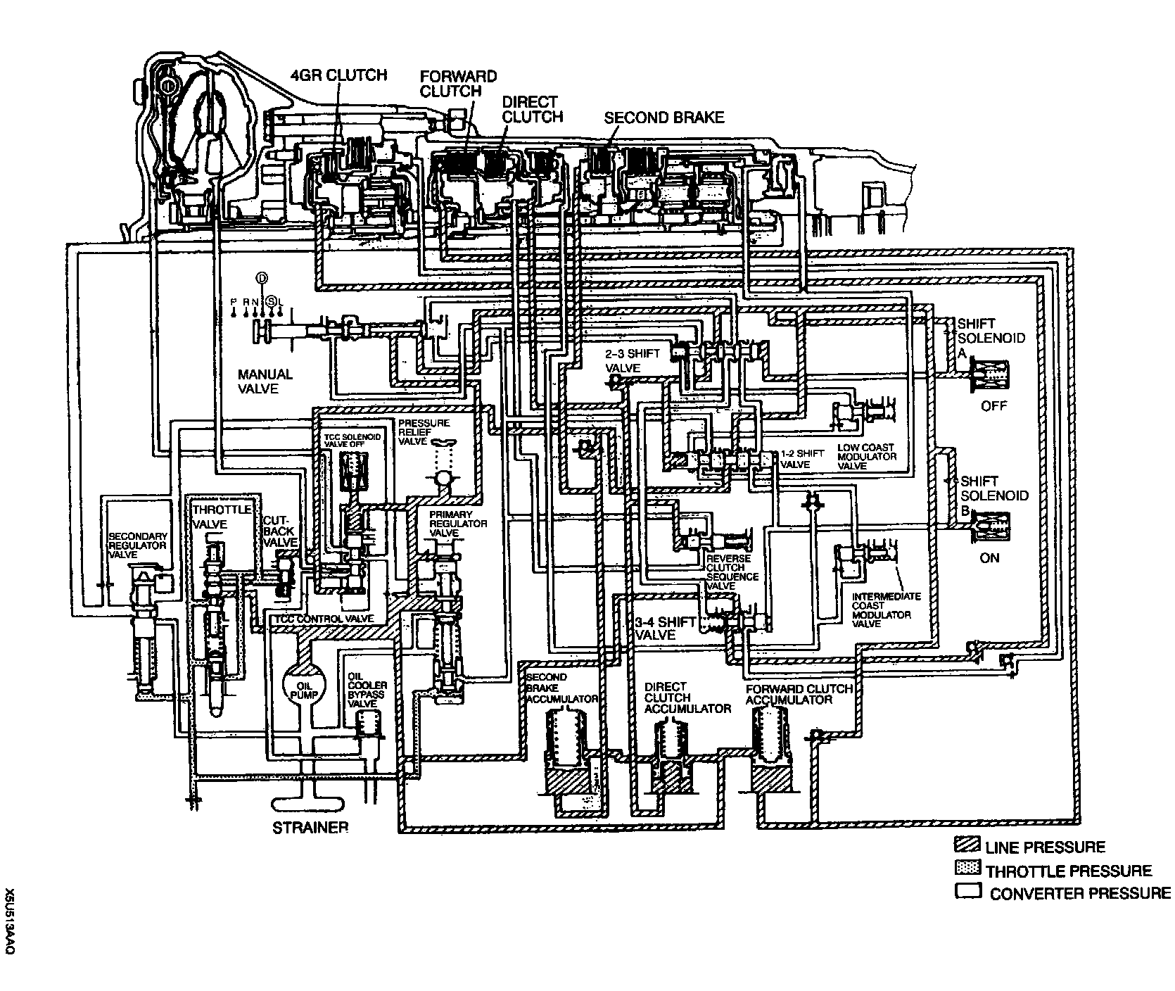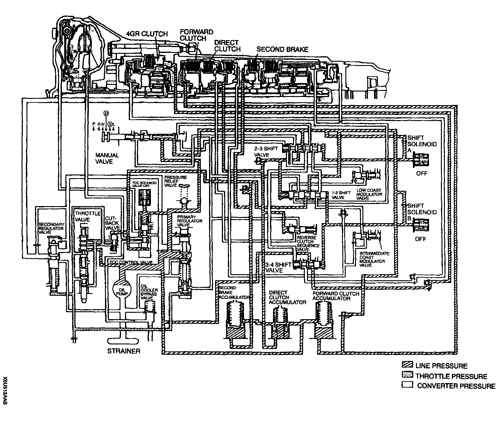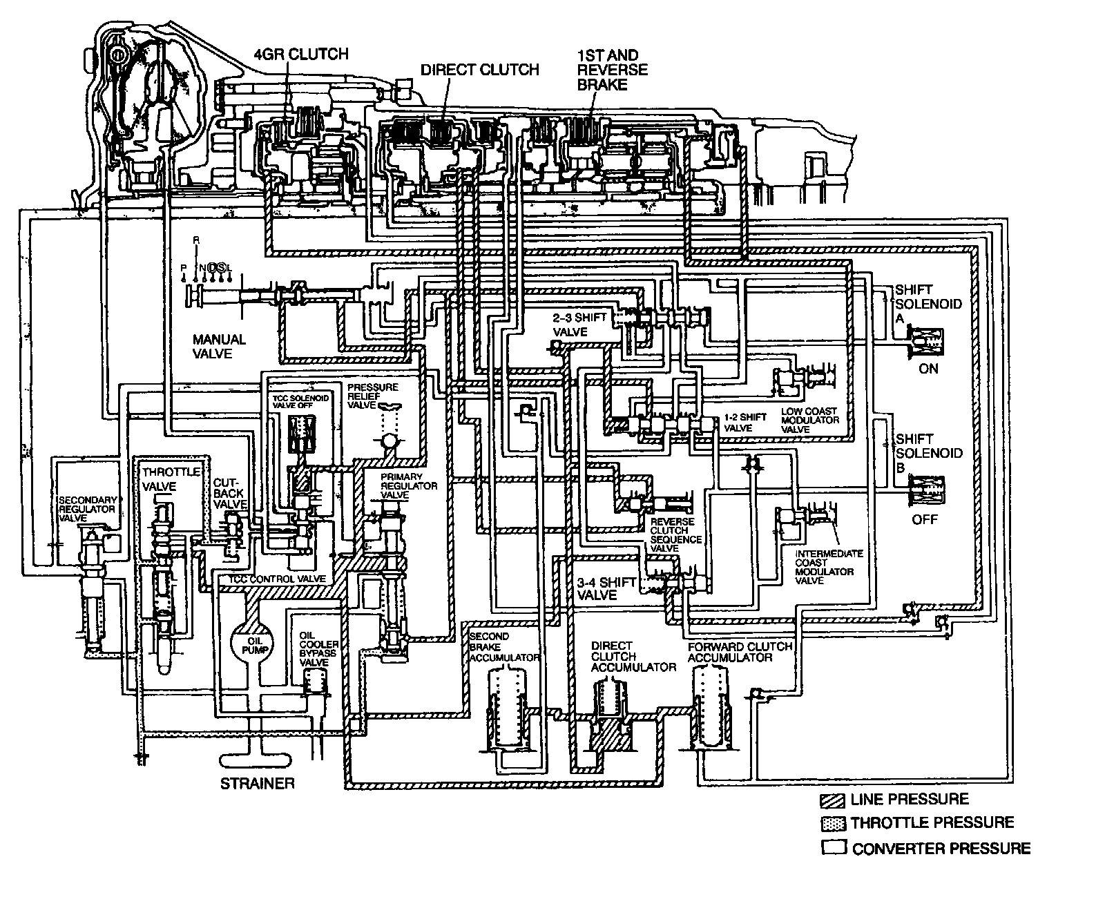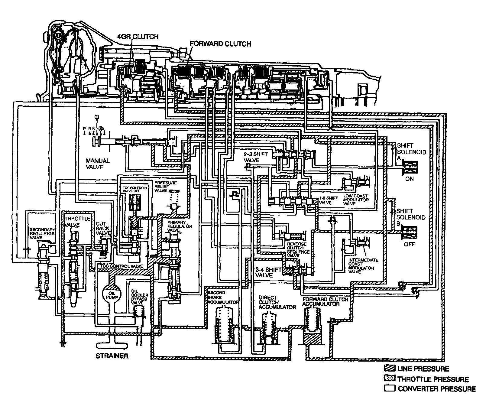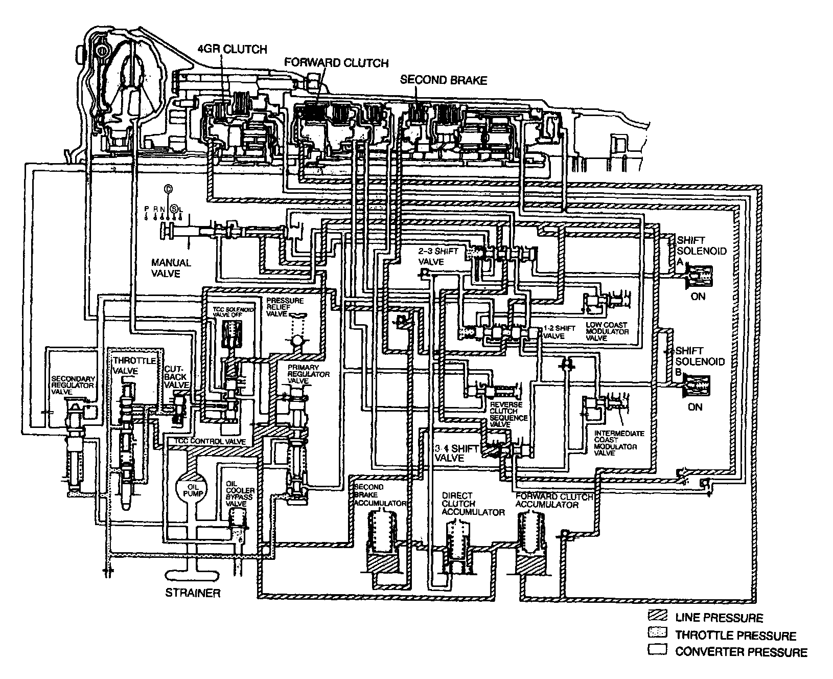 - The line pressure driven to the manual valve works on the forward clutch and 4GR clutch, engaging each clutch to be in first gear position. With the shift solenoid B off, the 1 - 2 shift valve is pushed to the left side, so the line pressure from the manual valve does not flow beyond the 1 - 2 shift valve.