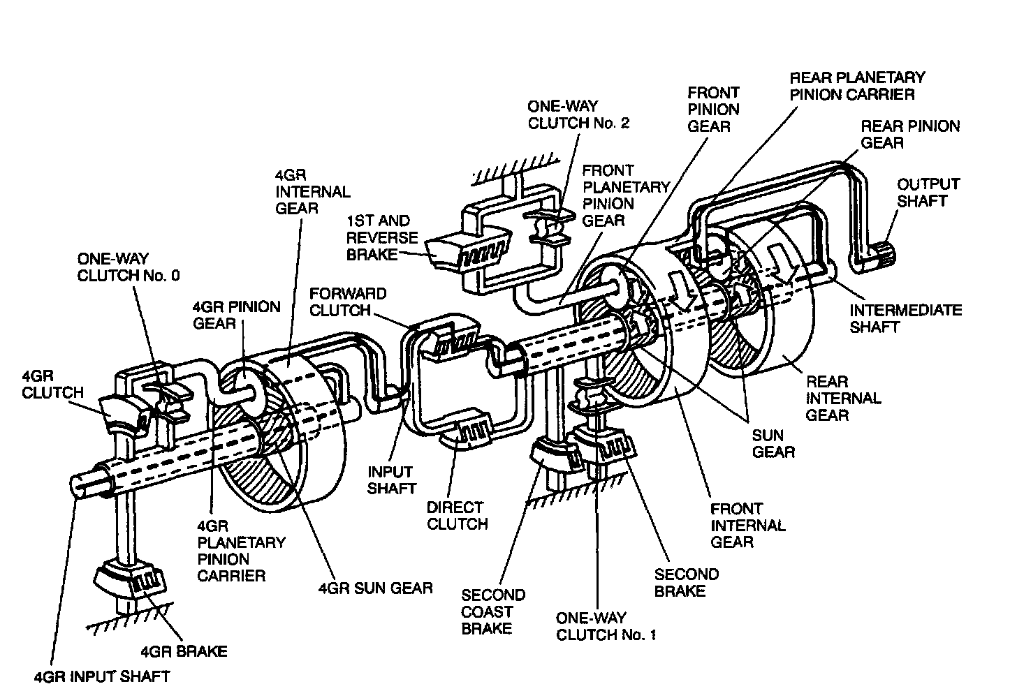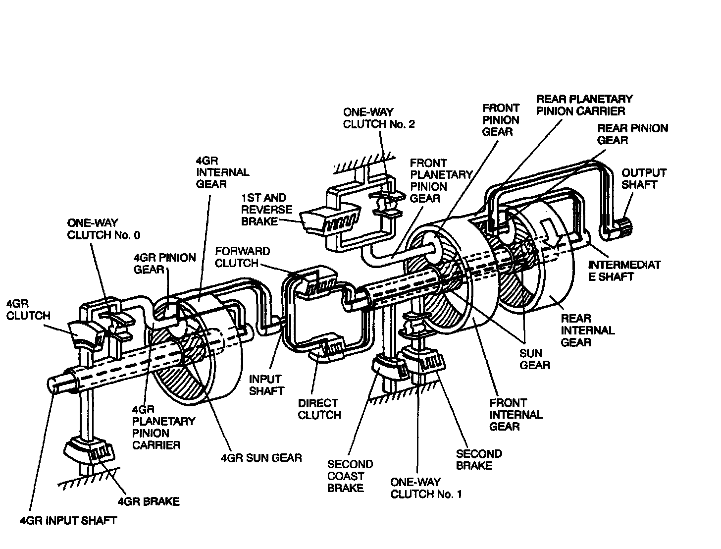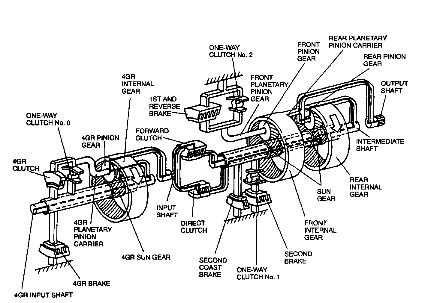 - The driving force of the 4GR input shaft is transmitted to the input shaft because 4GR clutch and one-way clutch No.0 are engaged, and 4GR planetary gear unit rotates as a unit. The driving force of the input shaft is transmitted to the rear internal gear through the forward clutch, causing the rear internal gear to rotate.