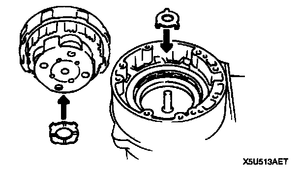 14. Apply petroleum jelly to forward clutch rear No. 1 race, thrust rear bearing, thrust bearing rear planetary ring race and install thrust bearing planetary ring race to direct clutch cylinder and forward clutch rear No. 1 race and thrust bearing to forward clutch hub.