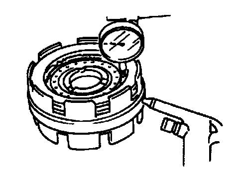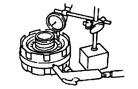 28. Using a dial indicator, measure the front clutch piston stroke applying and releasing the compressed air as shown.
