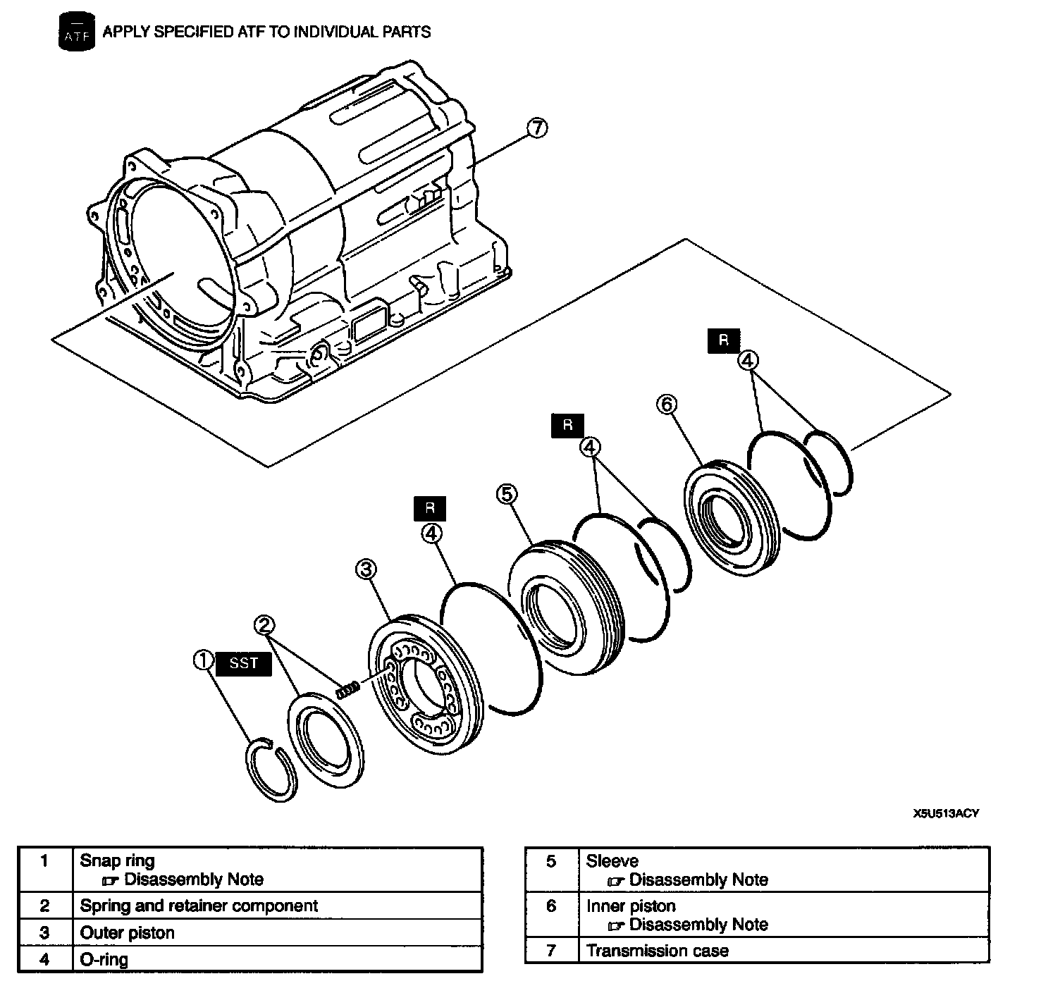 2. Clean all parts and holes by using compressed air and apply ATF to them immediately before assembly.