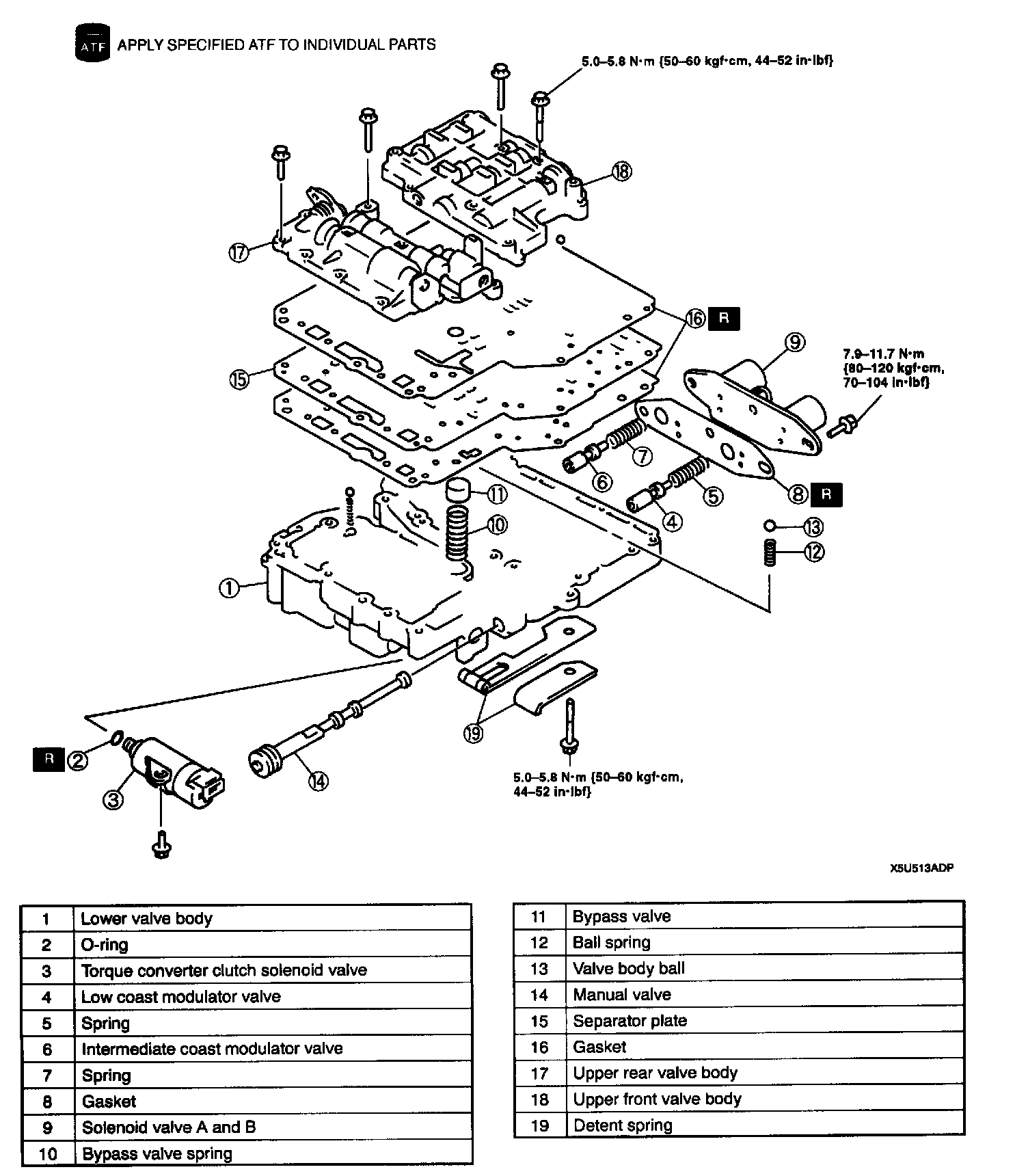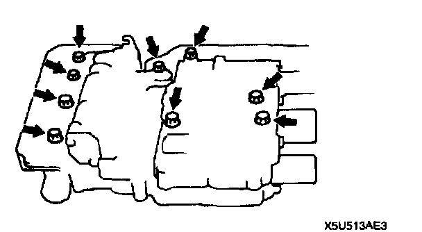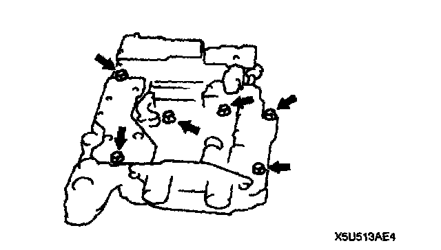 18. Turn over lower valve body and tighten 5 bolts indicated in figure at the left temporarily.