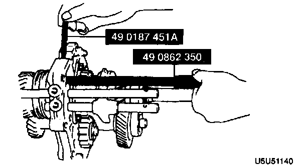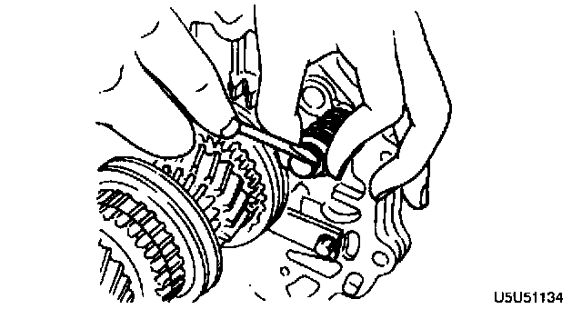 1. Shift the clutch hub sleeves into 1st and reverse gears to lock the rotation of the mainshaft.