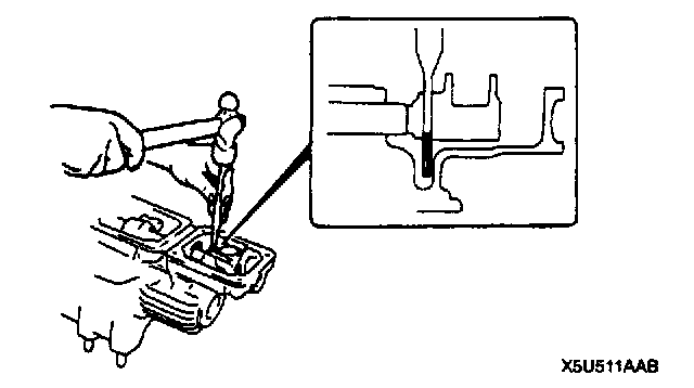 5. Verify that the centers of the shift fork and clutch hub sleeve are aligned properly. If they are not, select the proper washer to install between 1st gear and the mainshaft front bearing, and between reverse gear and the mainshaft front bearing.