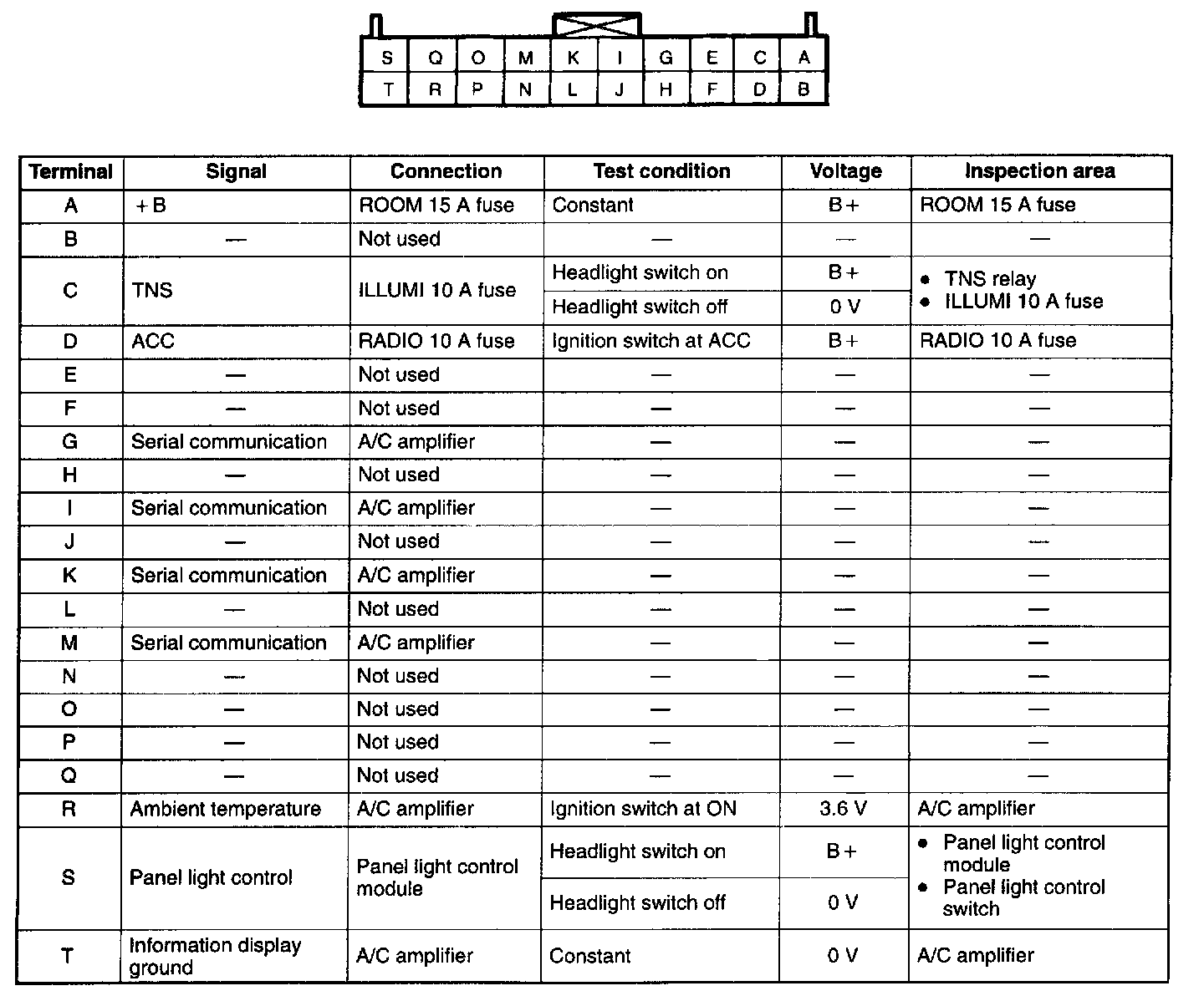 NOTE: Voltage at terminals G, I, K, and M cannot be measured because they are used for serial communication. To inspect terminals G, I, K, and M, refer to TROUBLE CODE DIAGNOSTIC PROCEDURES.