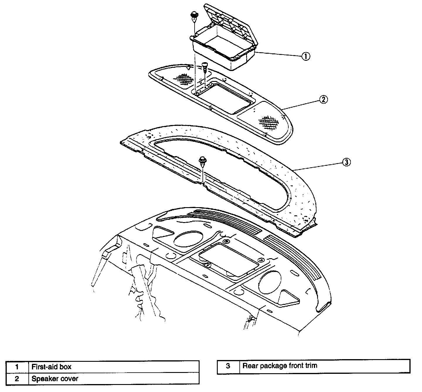 ^ Pull the speaker cover and rear package front trim upward to disengage the clips and the pins from the body.