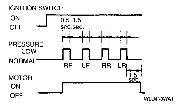 9. With the brake pedal still depressed, turn the ignition switch to ON and verify that the brake is released momentarily (approx. 0.5 sec.) and that the wheel turns when pressure-reduction operates.