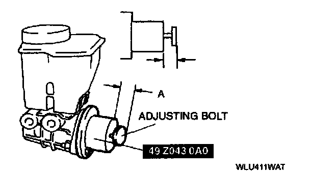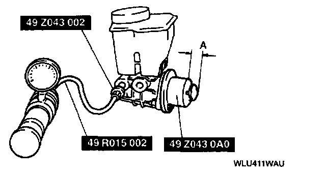 4. Tighten the adjustment bolt on the SST until gap A becomes 11 mm (0.43 inch). Raise the air pressure to 49 kPa (0.5 kgf/cm2, 7.1 psi) and verify that the pressure is held for more than 5 seconds.