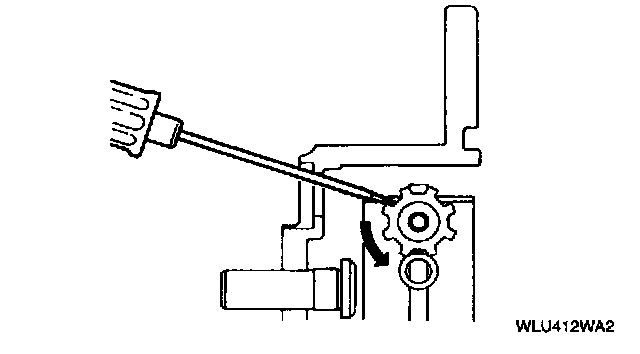 2) Insert a screwdriver into the hole and turn the adjuster in the opposite direction of the arrow marked on the disc plate.