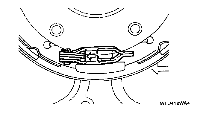 2. Install the adjuster between the brake shoes with the threaded part facing the front on the left wheel and the rear on the right wheel.
