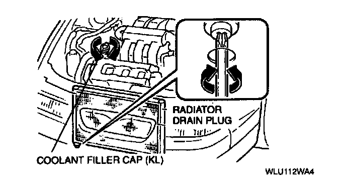 1. Remove the coolant filler cap (KL) and radiator cap and loosen the radiator drain plug.