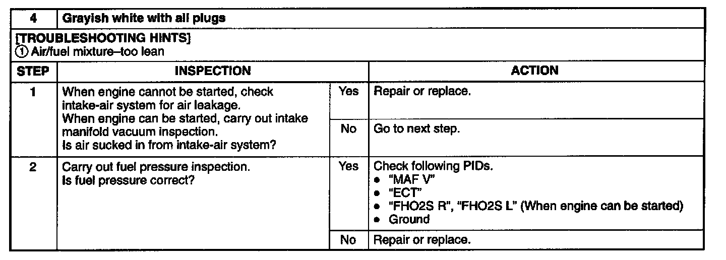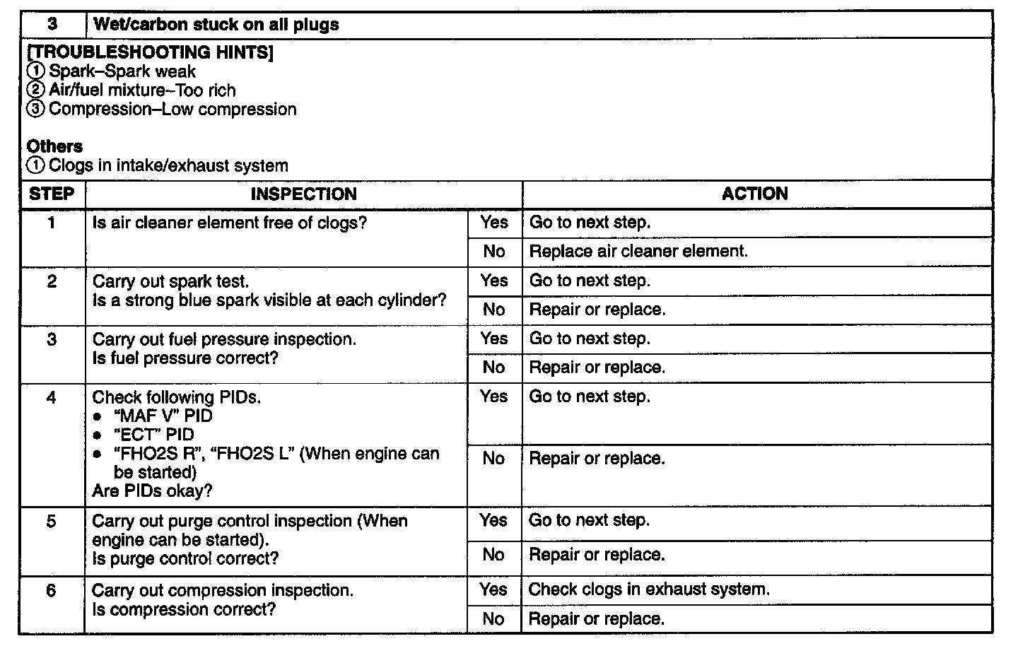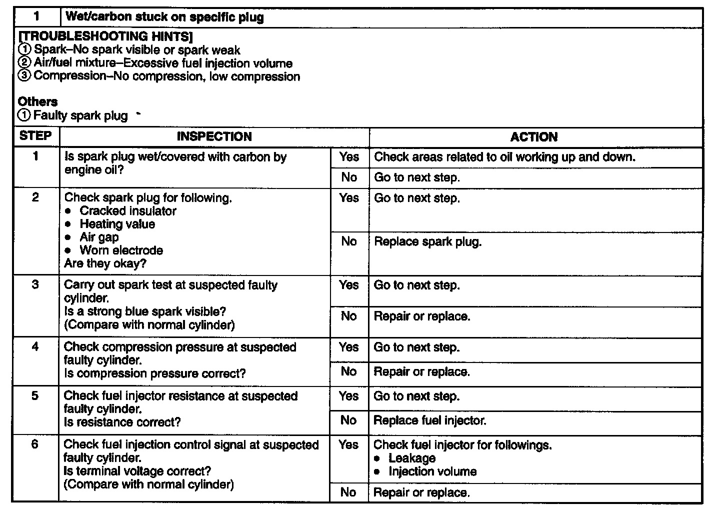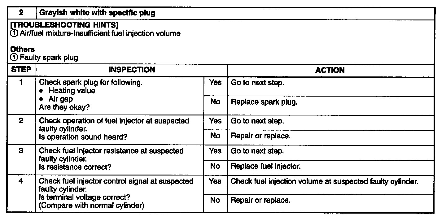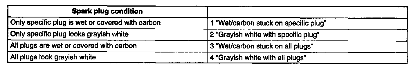 By checking condition of the spark plugs, judgement whether problem is related to a specific cylinder or all cylinders is possible.