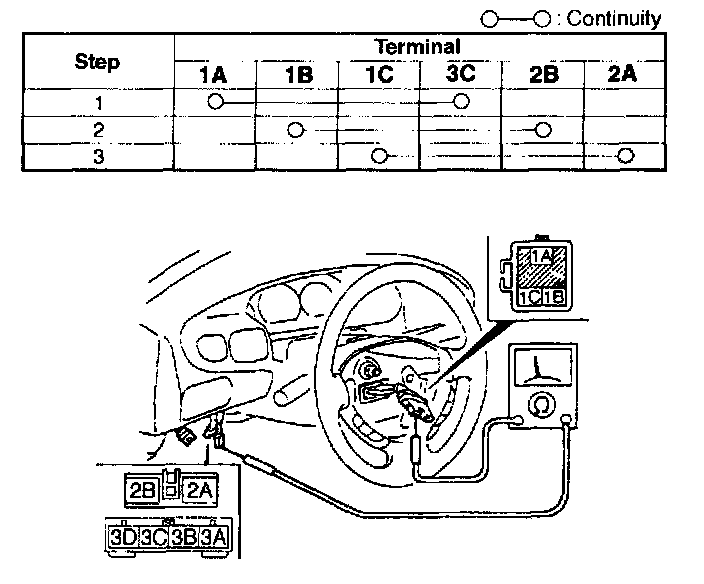 4. Inspect for continuity between the clock spring terminals by using an ohmmeter.