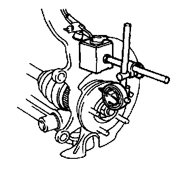 2. Position a dial indicator against the wheel hub. Push and pull the wheel hub by hand in the axial direction and measure the wheel bearing play.