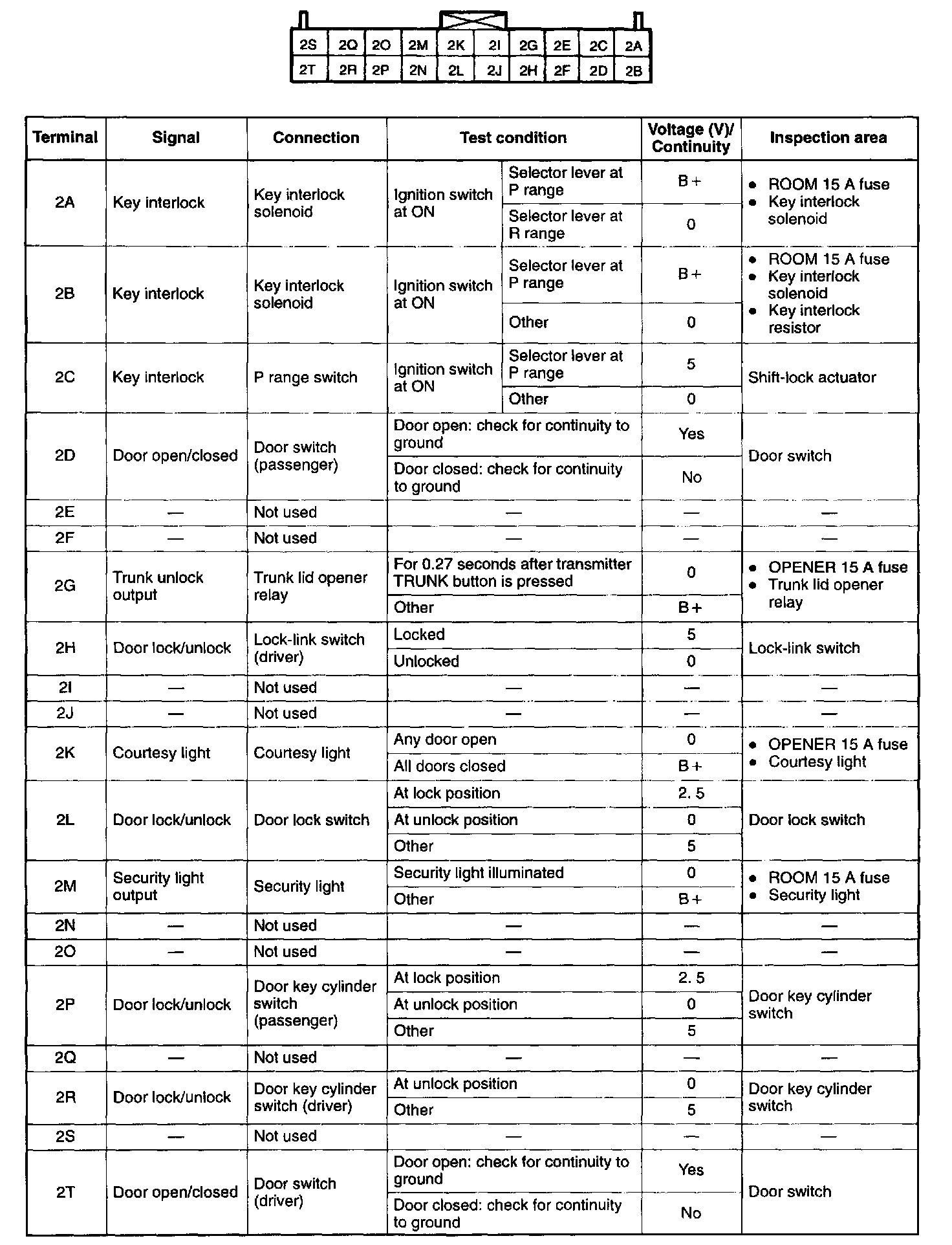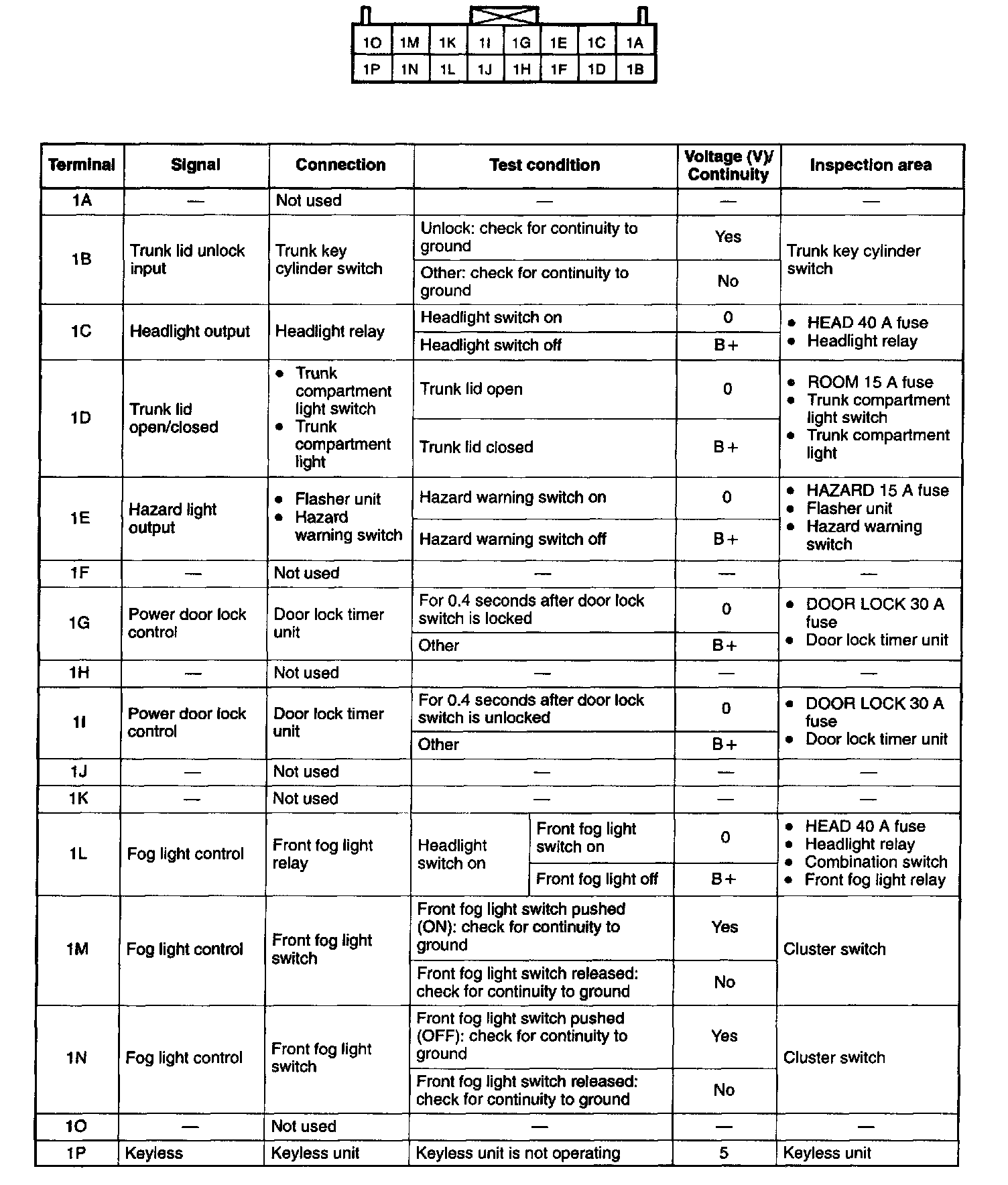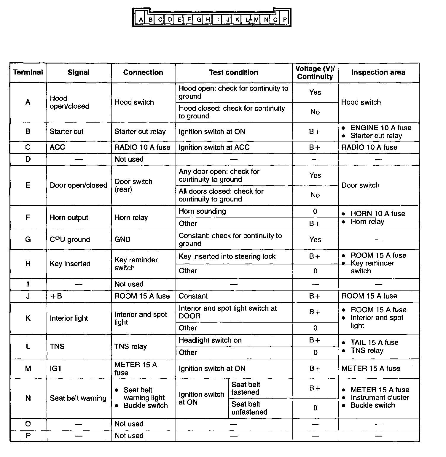 Connector B, C, and D (Terminals except 1B, 1M, 1N, 2D, 2T, 3A, 3F, 3H, 3J, and 3K)