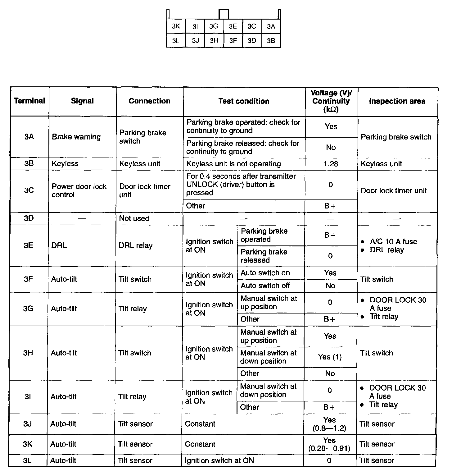 - When measuring the voltage at terminal 3B of connector D, use a voltmeter with sufficiently high input impedance (1M ohm or more).