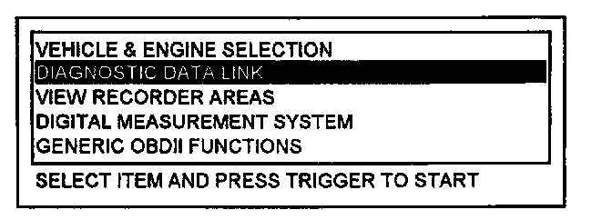 1. After setting up the NGS tester for current vehicle, select "DIAGNOSTIC DATA LINK" and press the TRIGGER.