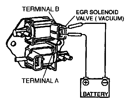 2. Apply battery positive voltage to terminal A and ground terminal B of the EGR solenoid valve (vacuum). Verify that air flows as shown.