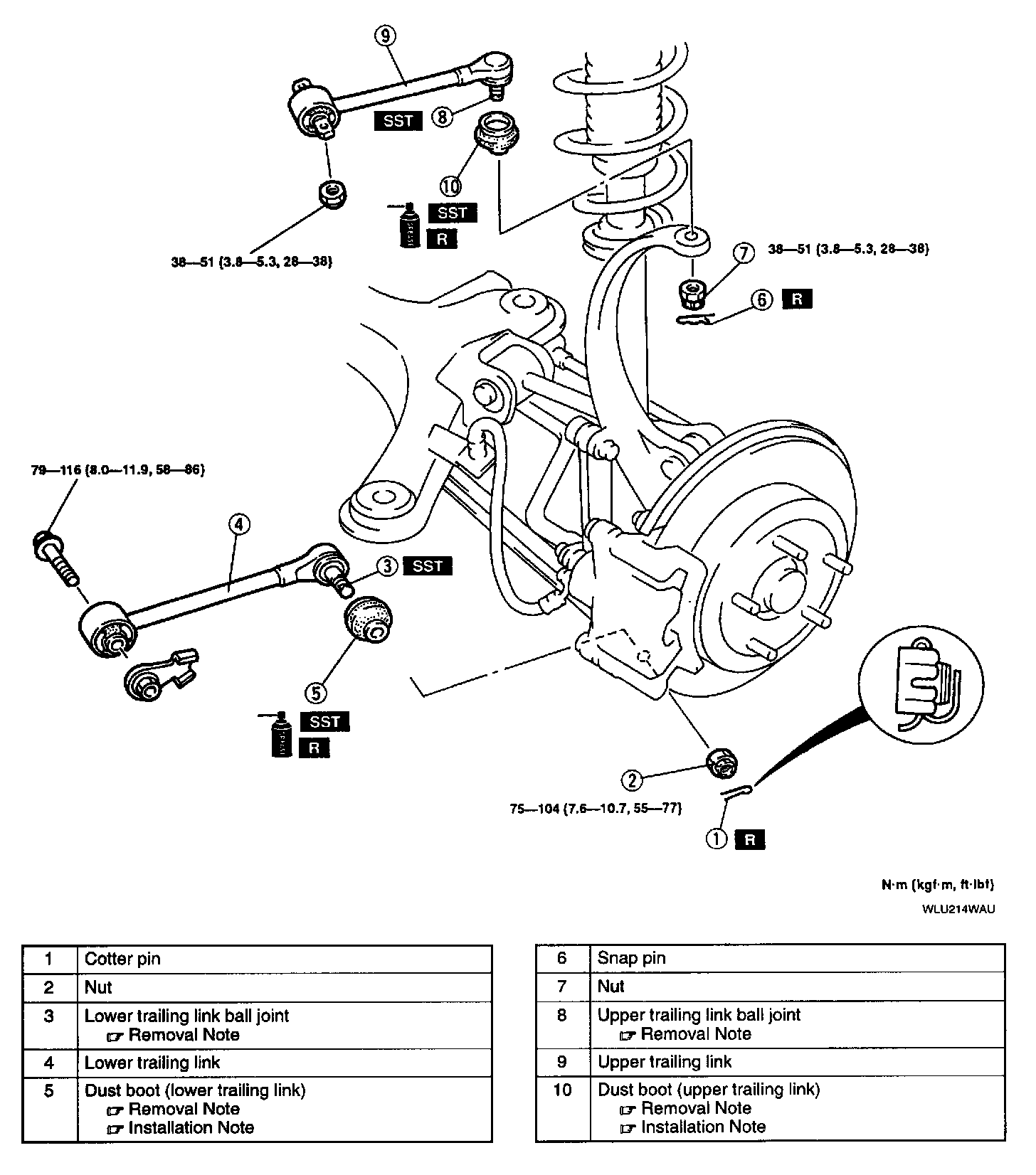 Upper trailing link: 14 - 15 Nm {140 - 160 kgf.cm, 122 - 138 inch lbs.}