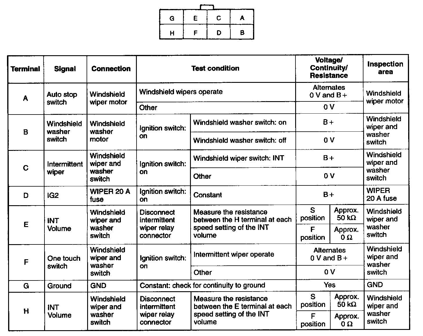 INTERMITTENT WIPER RELAY INSPECTION1. Measure the voltage of the intermittent wiper relay as indicated below.