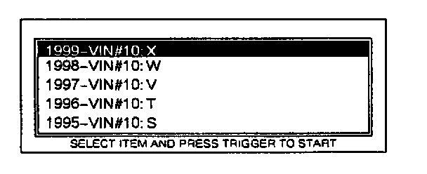 4. Move the cursor to 1999 - VIN # 10:X. Press TRIGGER to enter this selection.
