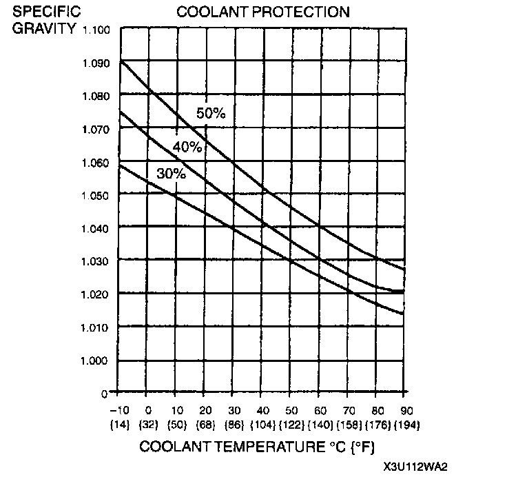 2. Determine the coolant protection by referring to the graph shown. If the coolant protection is not proper, add water or coolant.