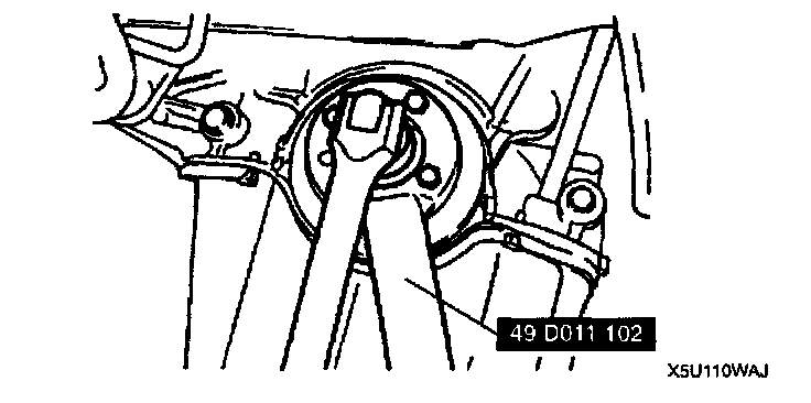 6. Hold the crankshaft using the Special Service Tool (SST), and remove the pulley lock bolt and the pulley boss.