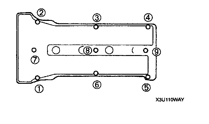 4. Tighten the cylinder head cover bolts a few turns in the order shown.