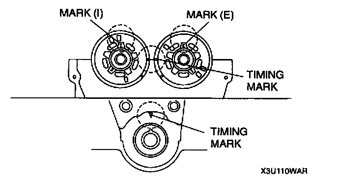 - Face the marks (I) and (E) of the camshaft pulley straight up, then align the timing marks with the horizontal surface on the cylinder head.