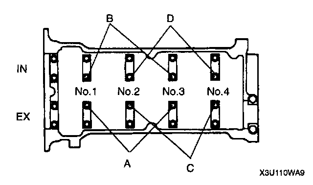 - For IN side No.2, 3 cylinder adjustment shim removal, remove either bolt B or D.