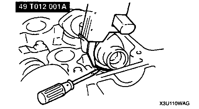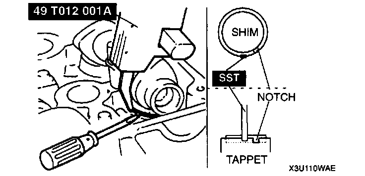 11. Using a fine screwdriver, pry up the adjustment shim through the notch on the tappet. Remove the shim using a magnet.