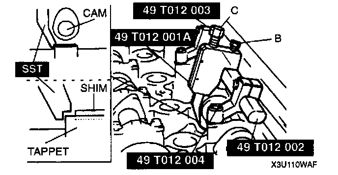 10. Tighten bolt C, and press down the tappet.