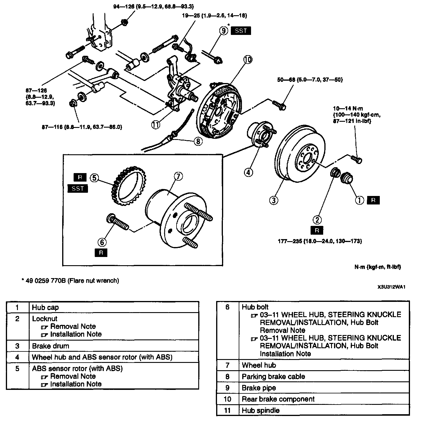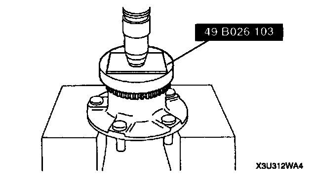 WHEEL HUB, HUB SPINDLE REMOVAL/INSTALLATIONCAUTION: Performing the following procedures without first removing the ABS wheel-speed sensor may possibly cause an open circuit in the harness if it is pulled by mistake. Before performing the following procedures, remove the ABS wheel-speed sensor (axle side) and fix it to an appropriate place where the sensor will not be pulled by mistake while servicing the vehicle.